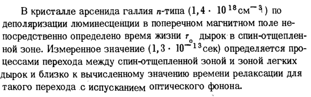В кристалле арсенида галлия п-типа (1,4 · 1018см"~3) по деполяризации люминесценции в поперечном магнитном поле непосредственно определено время жизни tq дырок в спин-отщеплен-ной зоне. Измеренное значение (1,3 · 1(Р13сек) определяется процессами перехода между спин-отщепленной зоной и зоной легких дырок и близко к вычисленному значению времени релаксации для такого перехода с испусканием оптического фонона.