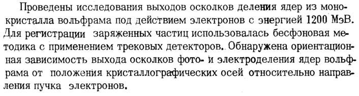 Проведены исследования выходов осколков деления ядер из монокристалла вольфрама под действием электронов с энергией 1200 МэВ, Для регистрации заряженных частиц использовалась бесфоновая методика с применением трековых детекторов. Обнаружена ориентацион-ная зависимость выхода осколков фотоto электроделения ядер вольфрама от положения кристаллографических осей относительно направления пучка электронов.