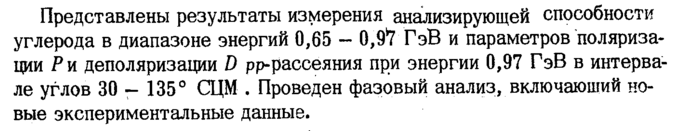 Представлены результаты измерения анализирующей способности углерода в диапазоне энергий 0,65 0,9*7 ГэВ и параметров поляризации Ρ и деполяризации D рр-рассеяния при энергии 0,97 ГэВ в интервале углов 30-135° СЦМ . Проведен фазовый анализ, включающий новые экспериментальные данные.