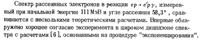 Спектр рассеянных электронов в реакции ер-> еру, измеренный при начальной энергии 111 МэВ и угле рассеяния 58,3° , сравнивается с несколькими теоретическими расчетами. Впервые обнаружено хорошее согласие эксперимента в широком диапазоне спектра с расчетами [6], основанными на процедуре "экспоненцирования".