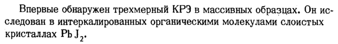 Впервые обнаружен трехмерный КРЭ в массивных образцах. Он исследован в интеркалированных органическими молекулами слоистых кристаллах Pb'J