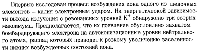 Впервые исследован процесс возбуждения иона одного из щелочных элементов калия электронным ударом. На энергетической зависимости выхода излучения с резонансных уровней К+ обнаружено три острых максимума. Предполагается, что их появление обусловлено захватом бомбардирующего электрона на автоионизационные уровни нейтрального атома, распад которых приводит к резкому увеличению заселенности нижних возбужденных состояний иона.