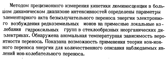 Методом прецизионного измерения кинетики люминесценции в большом динамическом диапазоне интенсивностей определены параметры элементарного акта безызлучательного переноса энергии электронного возбуждения редкоземельных ионов на примесные локальные ко -лебания гидроксильных групп в стеклообразных неорганических диэлектриках. Обнаружена аномальная температурная зависимость вероятности переноса. Показана возможность применения теории ион-ионного переноса энергии для количественного описания наблюдаемых явлений ион-колебательного переноса.