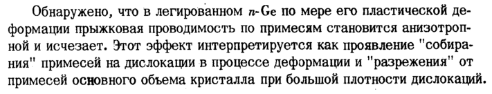 Обнаружено, что в легированном re-Ge по мере его пластической деформации прыжковая проводимость по примесям становится анизотропной и исчезает. Этот эффект интерпретируется как проявление "собирания" примесей на дислокации в процессе деформации и "разрежения" от примесей основного объема кристалла при большой плотности дислокаций,