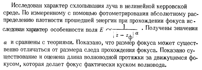 Исследован характер охлопывания луча в нелинейной керровской среде. По измеренному с помощью фотометрирования абсолютному распределению плотности прошедшей энергии при прохождении фокуса ис следован характер особенности поля Ε -——· Получены значения ι г ζφ| а а и сравнены с теориями. Показано, что размер фокуса может существенно отличаться от размера следа прохождения фокуса. Показано существование и оценена длина волноводной протяжки за движущимся фокусом, которая делает фокус фактически куском волновода.