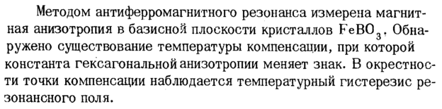 Методом антиферромагнитного резонанса измерена магнитная анизотропия в базисной плоскости кристаллов FeB03, Обнаружено существование температуры компенсации, при которой константа гексагональной анизотропии меняет знак. В окрестности точки компенсации наблюдается температурный гистерезис резонансного поля.