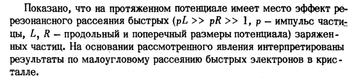 Показано, что на протяженном потенциале имеет место эффект ре-резонансного рассеяния быстрых (pL » pR» 1, ρ импульс частицы, L, # ~ продольный и поперечный размеры потенциала) заряженных частиц. На основании рассмотренного явления интерпретированы результаты по малоугловому рассеянию быстрых электронов в кристалле.