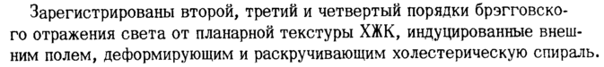Зарегистрированы второй, третий и четвертый порядки брэгговско-го отражения света от планарной текстуры ХЖК, индуцированные внешним полем, деформирующим и раскручивающим холестерическую спираль.