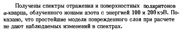 Получены спектры отражения и поверхностных поляритонов α-кварца, облученного ионами азота с энергией 100 и 200 кэВ. Показано, что простейшие модели поврежденного слоя при расчете не дают наблюдаемых изменений в спектрах.