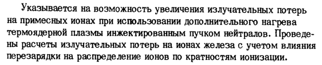 Указывается на возможность увеличения излучательных потерь на примесных ионах при использовании дополнительного нагрева термоядерной плазмы инжектированным пучком нейтралов. Проведены расчеты излучательных потерь на ионах железа с учетом влияния перезарядки на распределение ионов по кратностям ионизации.