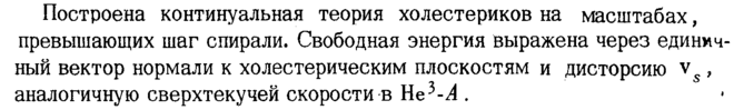 Построена континуальная теория холестериков на масштабах, превышающих шаг спирали. Свободная энергия выражена через единичный вектор нормали к холестерическим плоскостям и дисторсию у8 , аналогичную сверхтекучей скорости в He3-i .
