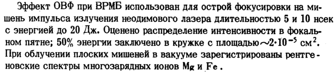 Эффект ОВФ при ВРМБ использован для острой фокусировки на мишень импульса излучения неодимового лазера длительностью 5 и 10 нсек с энергией до 20 Дж. Оценено распределение интенсивности в фокальном пятне; 50% энергии заключено в кружке с площадью^2· 10"5 см2. При облучении плоских мишеней в вакууме зарегистрированы рентгеновские спектры многозарядных ионов и Fe .