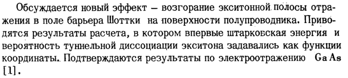 Обсуждается новый эффект возгорание экситонной. полосы отражения в поле барьера Шоттки на поверхности полупроводника. Приводятся результаты расчета, в котором впервые штарковская энергия и вероятность туннельной диссоциации экситона задавались как функции координаты., Подтверждаются результаты по электроотражению Ga As [1].