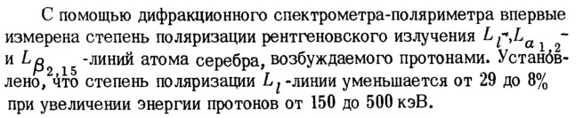 С помощью дифракционного спектрометра-поляриметра впервые измерена степень поляризации рентгеновского излучения ^f>La 1 ς и ίβ -линий атома серебра, возбуждаемого протонами. Устанбв-лено, что степень поляризации -линии уменьшается от 29 до 8% при увеличении энергии протонов от 150 до 500 кэВ.
