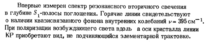 Впервые измерен спектр резонансного вторичного свечения в глубине S ^полосы поглощения. Горячие линии свидетельствуют о наличии квазисвязанного фонона внутренних колебаний ν395см""1. При поляризации возбуждающего света вдоль а оси кристалла линии КР приобретают вид, не подчиняющийся элементарной трактовке.