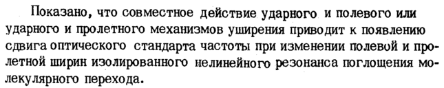 Показано, что совместное действие ударного и полевого или ударного и пролетного механизмов уширения приводит к появлению сдвига оптического стандарта частоты при изменении полевой и пролетной ширин изолированного нелинейного резонанса поглощения молекулярного перехода.