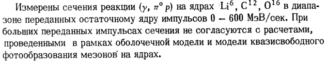 Измерены сечения реакции (у, π° р) на ядрах Li6, С12, О16 в диапазоне переданных остаточному ядру импульсов 0 600 МэВ/сек. При больших переданных импульсах сечения не согласуются с расчетами, проведенными в рамках оболочечной модели и модели квазисвободного фотообразования мезонов на ядрах.