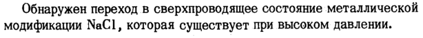 Обнаружен переход в сверхпроводящее состояние металлической модификации NaCl, которая существует при высоком давлении.