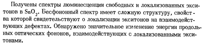 Получены спектры люминесценции свободных и локализованных экси-тонов в Sn02. Бесфононный спектр имеет сложную структуру, свойства которой свидетельствуют о локализации экситонов на взаимодействующих дефектах. Обнаружено значительное изменение энергии продольных оптических фононов, взаимодействующих с локализованными экси-тонами.