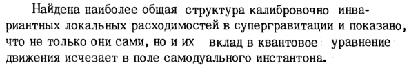 Найдена наиболее общая структура калибровочно инвариантных локальных расходимостей в супергравитации и показано, что не только они сами, но и их вклад в квантовое уравнение движения исчезает в поле самодуального инстантона.