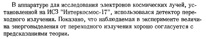 В аппаратуре для исследования электронов космических лучей, установленной на ИСЗ "Интеркосмос-17", использовался детектор переходного излучения. Показано, что наблюдаемая в эксперименте величина энерговыделения от переходного излучения хорошо согласуется с предсказаниями теории.