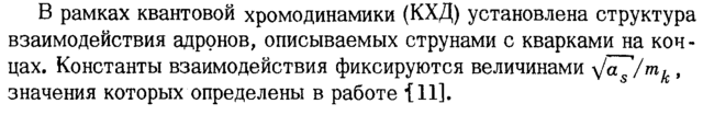 В рамках квантовой хромодинамики (КХД) установлена структура взаимодействия адронов, описываемых струнами с кварками на концах. Константы взаимодействия фиксируются величинами \fa~^/mk , значения которых определены в работе 111].