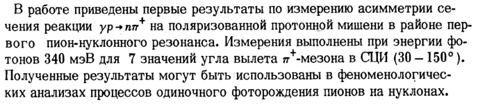 В работе приведены первые результаты по измерению асимметрии сечения реакции γρ->ηπ* на поляризованной протонной мишени в районе первого пион-нуклонного резонанса. Измерения выполнены при энергии фотонов 340 мэВ для 7 значений угла вылета 77+-мезона в СЦИ (30 —150°). Полученные результаты могут быть использованы в феноменологических анализах процессов одиночного фоторождения пионов на нуклонах.