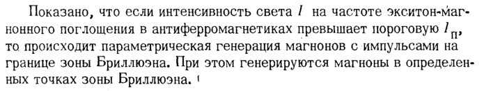 Показано, что если интенсивность света / на частоте экситон-маг-нонного поглощения в антиферромагнетиках превышает пороговую /п, то. происходит параметрическая генерация магнонов с импульсами на границе зоны Бриллюэна. При этом генерируются магноны в определен ных точках зоны Бриллюэна. ι