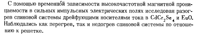 С помощью временной зависимости высокочастотной магнитной проницаемости в сильных импульсных электрических полях исследован разогрев спиновой системы дрейфующими носителями тока в CdCr2Se4 и EuO. Наблюдались как перегрев, так и недогрев спиновой системы по отношению к решетке.