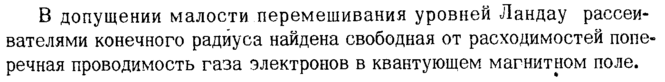 В допущении малости перемешивания уровней Ландау рассеи-вателями конечного радиуса найдена свободная от расходимостей поперечная проводимость газа электронов в квантующем магнитном поле.