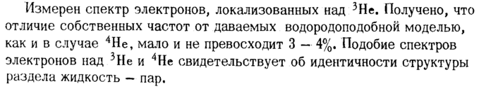 Измерен спектр электронов, локализованных над 3Не. Получено, что отличие собственных частот от даваемых водородоподобной моделью, как и в случае 4Не, мало и не превосходит 3 — 4%. Подобие спектров электронов над 3Не и 4Не свидетельствует об идентичности структуры раздела жидкость — пар.