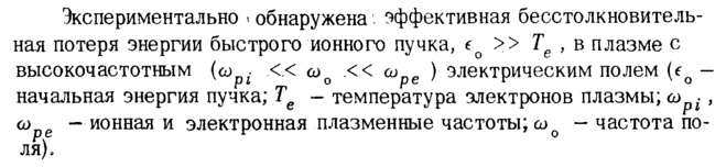 Экспериментально » обнаружена' эффективная бесстолкновитель-ная потеря энергии быстрого ионного пучка, <:о >> Г , в плазме с высокочастотным (ωρί « ωο .<< соре ) электрическим полем (*о -начальная энергия пучка; Те температура электронов плазмы; ωρ-, ωρβ ""ионная и электронная плазменные частоты; ωο частота поля).