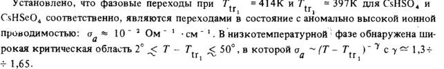 Установлено, что фазовые переходы при Т. =414К и Т. = 397К для CsHS04 и 0sHSe04 соответственно, являются переходами в состояние с аномально высокой ионной проводимостью: oQ * 10 ~ 2 Ом ~ 1 · см" 1. В низкотемпературной ; фазе обнаружена широкая критическая область 2° <L Τ Τχχ <. 50°, в которой oQ-(T ~Τχ )" 7 с 1,3-г -1,65. 1 Γι