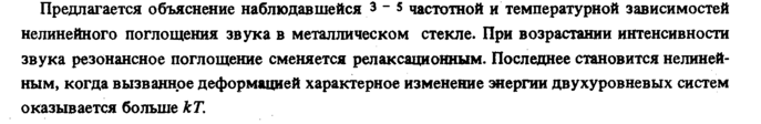 Предлагается объяснение наблюдавшейся 3 5 частотной и температурной зависимостей нелинейного поглощения звука в металлическом стекле. При возрастании интенсивности звука резонансное поглощение сменяется релаксационным. Последнее становится нелинейным, когда вызванное деформацией характерное изменение энергии двухуровневых систем оказывается больше кТ.