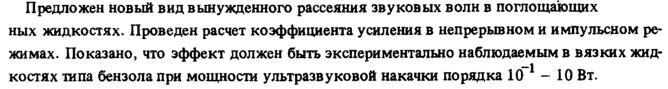 Предложен новый вид вынужденного рассеяния звуковых волн в поглощающих ных жидкостях. Проведен расчет коэффициента усиления в непрерьюном и импульсном режимах. Показано, что эффект должен быть экспериментально наблюдаемым в вязких жидкостях типа бензола при мощности ультразвуковой накачки порядка 10 1 10 Вт.