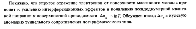 Показано, что упругое отражение электронов от поверхности массивного металла приводит к усилению интерференционных эффектов и появлению псевдодвумерной квантовой поправки к поверхностной проводимости Δσ ~\пТ. Обсужден вклад Δσ в нулевую аномалию туннельного сопротивления логарифмического типа.