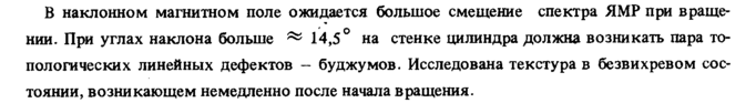 В наклонном магнитном поле ожидается большое смещение спектра ЯМР при вращении. При углах наклона больше ~ 14,5° на стенке цилиндра должна возникать пара топологических линейных дефектов буджумов. Исследована текстура в безвихревом состоянии, возникающем немедленно после начала вращения.