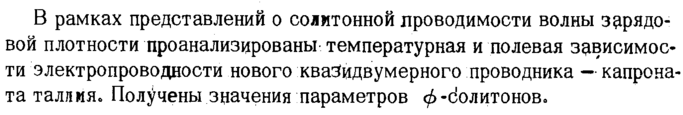 В рамках представлений о солитонной проводимости волны зарядовой плотности проанализированы температурная и полевая зависимости электропроводности нового кваЗидвумерного проводника — капрона-та таллия* Полечены значения параметров ^-(Золитоново