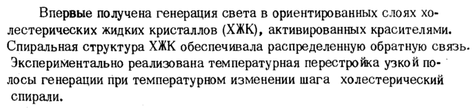 Впервые получена генерация света в ориентированных слоях хо-лестерических жидких кристаллов (ХЖК), активированных красителями. Спиральная структура ХЖК обеспечивала распределенную обратную связь. Экспериментально реализована температурная перестройка узкой полосы генерации при температурном изменении шага холестерический спирали.