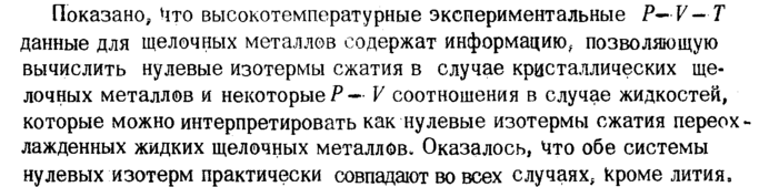 Показано, Uto высокотемпературные экспериментальные Р— Τ данные для щелочных металлов содержат информацию^ позволяющую вычислить нулевые изотермы сжатия в случае кристаллических щелочных металлов и некоторые Ρ -· V соотношения в случае жидкостей, которые можно интерпретировать как нулевые изотермы сжатия переохлажденных жидких щелочных металловОказалось, 4то обе системы нулевых изотерм практически совпадают во всех случаях, кроме лития,