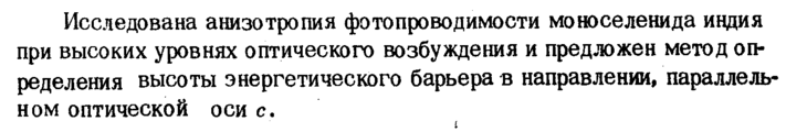 Исследована анизотропия фотопроводимости моноселенида индия при высоких уровнях оптического возбуждения и предложен метод определения высоты энергетического барьера в направлении, параллельном оптической оси с.