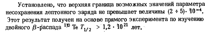 Установлено, что верхняя граница возможных значений параметра несохранения лептонного заряда не превышает величины (2 * 5)· 10 ~4. Этот результат получен на основе прямого эксперимента по изучению двойного /8-{>аспада 130 Те 7'1/2 > 1,2 · Ю21 лет.