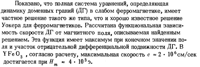 Показано, что полная система уравнений, определяющая динамику доменных граний (ДГ) в слабом ферромагнетике, имеет частное решение такого же типа, что и хорошо известное решение Уокера для ферромагнетиков. Рассчитана функциональная зависимость скорости ДГ от магнитного поля, описываемая найденным решением. Эта функция имеет максимум при конечном значении поля и участок отрицательной дифференциальной подвижности ДГ. В YFe03 , согласно расчету, максимальная скорость с = 2 · 106 см/сек достигается при Я « 4 · 103 э.