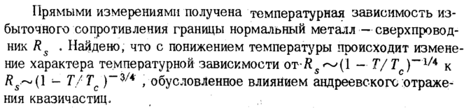 Прямыми измерениями получена температурная зависимость избыточного сопротивления границы нормальный металл — сверхпроводник Rs . Найдено, что с понижением температуры происходит изменение характера температурной зависимости от-Л5<~>(1 — Т/Т к /?5~(1 Т/ Тс /обусловленное влияйием андреевского отражения квазичастиц.