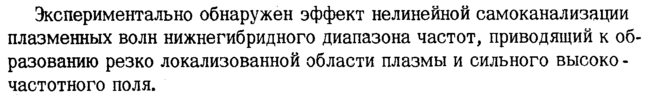 Экспериментально обнаружен эффект нелинейной самоканализации плазменных волн нижнегибридного диапазона частот, приводящий к образованию резко локализованной области плазмы и сильного высоко -частотного поля.