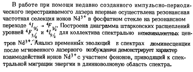 В работе при помощи недавно созданного импульсно-периоди-ческого перестраиваемого лазера впервые осуществлена резонансная частотная селекция ионов Nd3+ в фосфатном стекле на резонансном переходе 4/9/, -» 4Fy. Построена диаграмма штарковских расщеплений уровней *F}/ и 4/?// для коллектива спектрально неэквивалентных центров Ш3+/&нализ временных эволюций ε спектрах люминесценции после мгновенного лазерного возбуждения демонстрирует характер взаимодействий ионов Nd3+c участием фононов, приводящий к спектральной миграции энергии в длинноволновую область спектра.