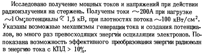 Исследовано получение мощных токов и напряжений при действии радиоизлучения на стержень. Получены токи <~200А при нагрузке г^ЛОм;потенциалы *< 1,5 кВ, при плотностях потока ^ЛОО кВт/см2. Указаны возможные механизмы генерации тока и создания, потенциалов, во много раз превосходящих энергии осцилляции электронов. По-показана возможность эффективного преобразования энергии радиоволн в энергию тока с Й1Д > 10%.