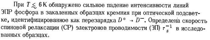 При Τ <^ 6 К обнаружено сильное падение интенсивности линий ЭПР фосфора в закаленных образцах кремния при оптической подсветке, идентифицированное как перезарядка 0° -> D~\ Определена скорость спиновой релаксации (CP) электронов проводимости (ЭП) г"1 в исследованных образцах,