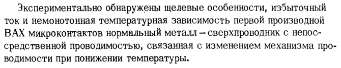 Экспериментально обнаружены щелевые особенности, избыточный ток и немонотонная температурная зависимость первой производной ΒΑΧ микроконтактов нормальный металлсверхпроводник с непос-средственной проводимостью, связанная с изменением механизма проводимости при понижении температуры.