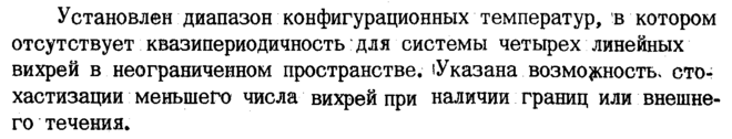 Установлен диапазон конфигурационных температур, в котором отсутствует квазипериодичность для системы четырех линейных вихрей в неограниченном пространстве, Сказана возможность, сто-хастизации меньшего числа вихрей при наличии границ или внешнего течения.